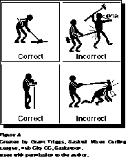 Hair Brushes. About 40 or 50 curlers may never forget my grand and charitable gesture in cash spiel game last year (96/97) It was an offer of help to sweep a rock in a game last year when it appeared that a draw was especially light. Ready to risk life and limb to sprint out and dig in with my 10-year old 8-Ender Brush, I called to the sweepers as the stone crawled down the ice, "Line's okay. Need help?" No answer from the sweepers. I repeated. "DO YOU NEED HELP!!!???" As I charged out to help in full stride came the playfully insulting reply "Okay, Billy. Go get somehelp, will ya?" I stopped, dead cold . I've heard of body language but I didn't know until then that person's whole body could talk. Mine sorta went. "HUH?" Picture Wile E. Coyote. In that pregnant pause I was fair -game in freeze-frame. All that was missing was a sign to hold up. "IDIOT". Good thing I had a brush. What to do with your hands at a time like that? If you have a brush made with hair, you can slither away from the scene, avoiding eye contact as you occupy your pride, preening the hairs. Doing so, one can abort theconvulsive hilarity or salve the embarrassment, as the incident requires. This passes for humility or grace.